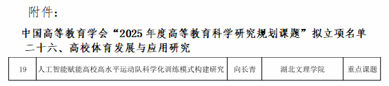 (通讯员 富昱 蔡昀洁)近日,2025年度高等教育科学研究规划课题立项名单揭晓,我院向长青讲师申报的“人工智能赋能高校高水平运动队科学化训练模式构建研究”成功入选高校体育发展与应用研究的重点课题。此次立项,既是对其科研能力的认可,也为学校体育学科科研添新力。